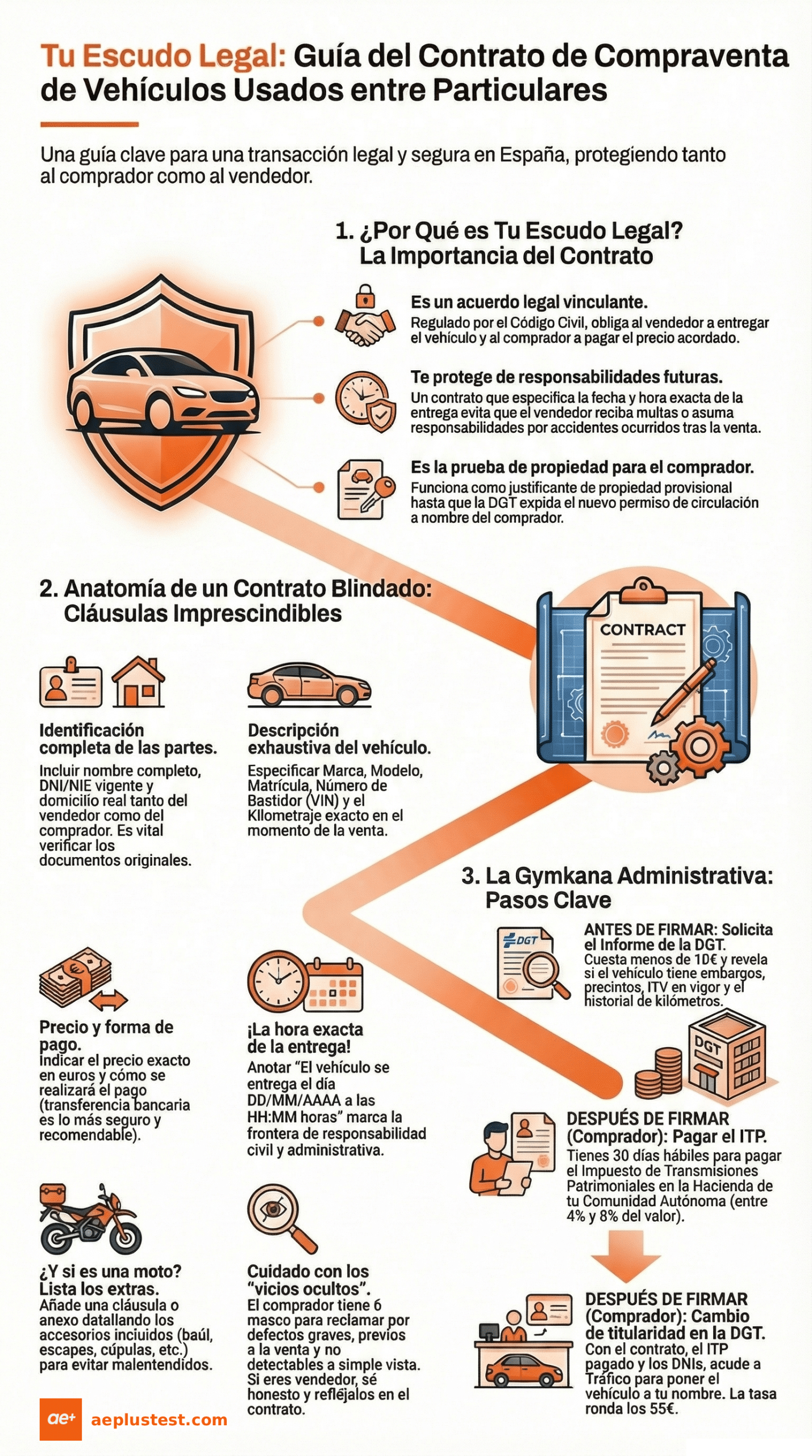 Si vendes, sé honesto. Refleja en el contrato los fallos que conoces (ej: «El aire acondicionado no enfría» o «Tiene un golpe en la aleta derecha»). Si está escrito y el comprador firma, no podrá reclamarte por eso después.